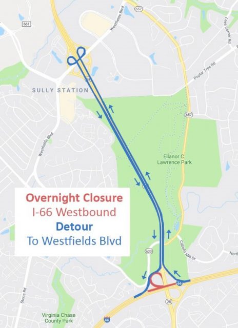 • Drivers will be detoured to Route 28 North to Westfields Boulevard westbound, then stay to the right for Route 28 South. Traffic can then follow signs to return to I-66 West or continue south on Route 28.