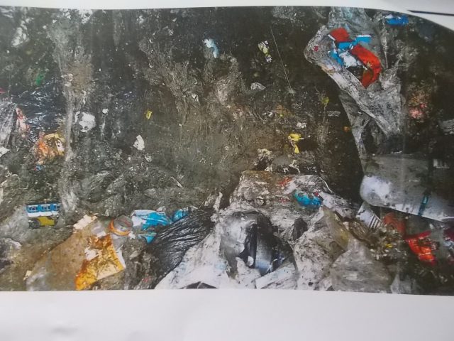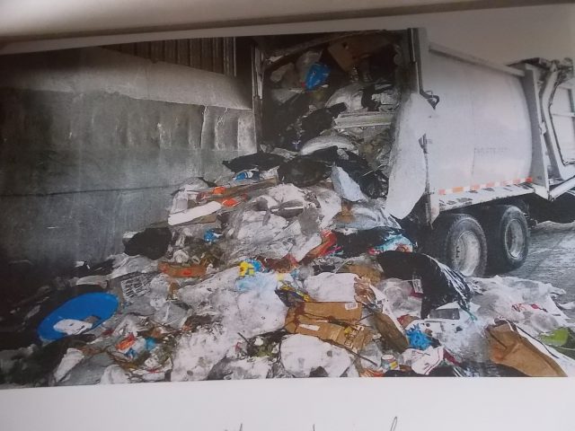 Sheriff’s power point photos: above DEQ photo illustrates treated material at Town WWTP that should be acceptable at County transfer station. Below, WCSO photo of mixed material found on Town trash truck on April 20.