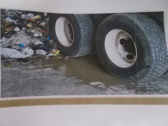 More WCSO evidentiary photos taken April 20: above, Town truck load of mixed layers of residential and WWTP collected materials; middle photo, close up of liquid running off that load and out of truck; and comparative WCSO photo of a Town trash truck dumping only residential garbage.