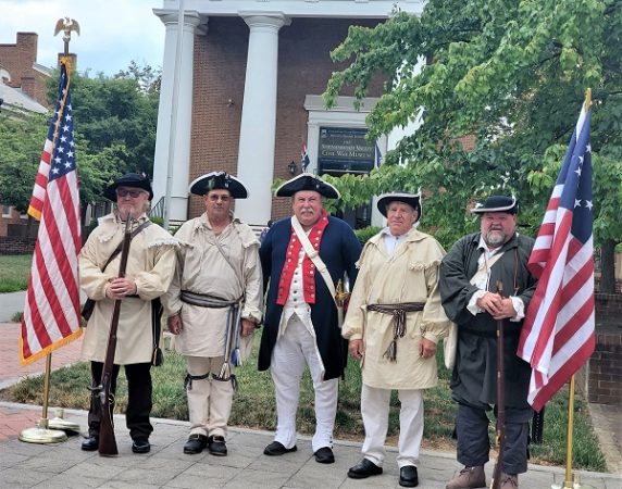 On July 4, 2021, the Colonel James Wood II Chapter of the Virginia Society Sons of the American Revolution participated in multiple events to commemorate Independence Day. They began with a march on the Winchester Walking Mall. Color Guard Commander Marc Robinson led Dale Corey, Thomas “Chip” Daniel, Kelly Ford, Doug Hall and Mike St. Jacques as they presented the colors and then read the Declaration of Independence. They next went to Middletown to participate in the annual parade. Participating with the chapter were President Marc Robinson with his wife Vangy, Vice President Thomas “Chip” Daniel, Sean Carrigan, Dale Corey, Doug Hall, Eric Robinson, Jim Simmons and Mike St. Jacques.