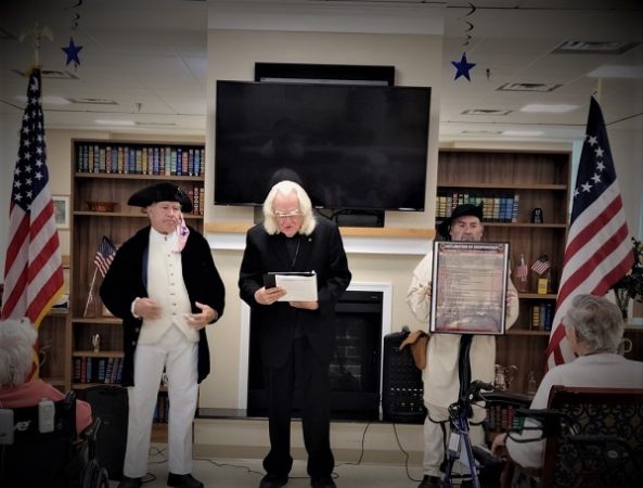 On July 5, 2021, the Colonel James Wood II Chapter of the Virginia Society Sons of the American Revolution provided readings of the Declaration of Independence to two senior living facilities in Warren County. They began the day at Hidden Springs Senior Living Facility in Bentonville with members Sean Carrigan, Dale Corey, Thomas “Chip” Daniel, Larry Johnson and Marc Robinson. After the reading, 101-year-old Frank Brandon presented the Colonel James Wood II Chapter with a framed 1st day stamp cover commemorating Independence Day. This was received by Chapter President Marc Robinson and Dale Corey. Next members Carrigan, Corey, Daniel and Robinson went to Commonwealth Senior Living Facility, Front Royal where they repeated the program. At both sites, the residents joined the compatriots in reciting the Pledge of Allegiance and singing “God Bless America”.