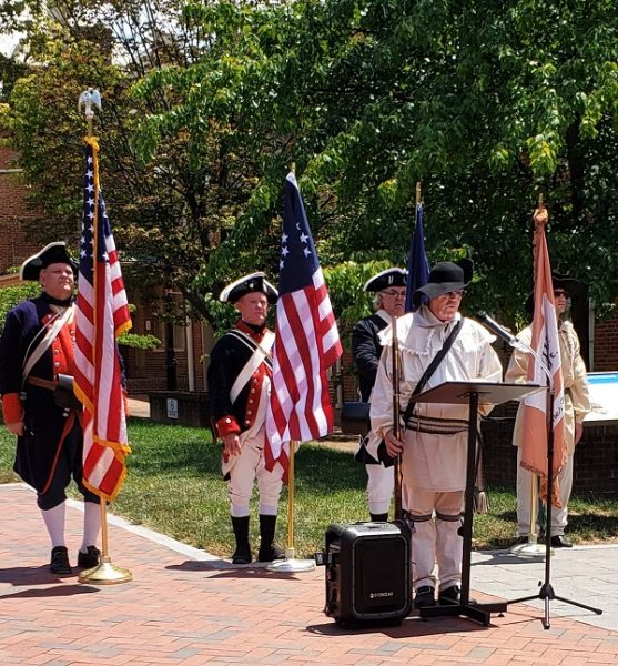 On July 3, 2021, the Colonel James Wood II Chapter of the Virginia Society Sons of the American Revolution participated in an Independence Day commemoration event by marching through the Winchester, Virginia Walking Mall and then presenting a reading of the Declaration of Independence. The color guard was led by Chapter President Marc Robinson. Participating in the reading of the document were Paul Christensen, Dale Corey, Thomas “Chip” Daniel, Marty Keesecker, Erick Moore, Allan Phillips, Nathan Poe, Marc Robinson, Jim Simmons and Mike St. Jacques.