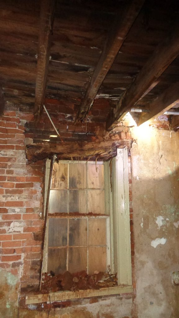 Above and below, the second floor; and yes that ceiling appears to be sagging as the window buttress crumbles beneath it.