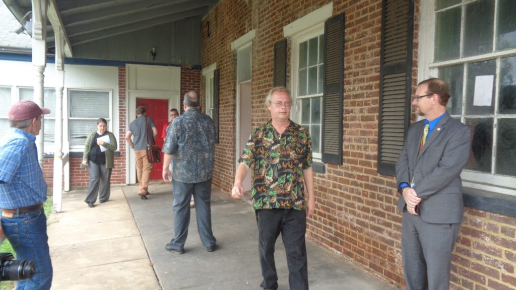 On Tuesday, August 15, the Front Royal Board of Architectural Review – well, at least the two male members, toured all three floors of the long-derelict brick monolith at the head of Front Royal’s downtown historic district. Also along for “the ride” were curious media and members of the town government, including Town Attorney Doug Napier and Planning Director Jeremy Camp. The tour was led by MODE Partnership Architect Jim Burton, who along with Front Royal-Warren County Economic Development Authority Executive Director Jennifer McDonald, answered questions from the architectural board members both before and after the tour.