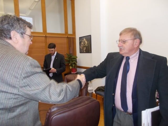 John Anzivino, right, is greeted by EDA Board Treasurer Tom Patteson at the Jan. 10 meeting at which his contract as interim executive director was approved. Royal Examiner File Photo/Roger Bianchini