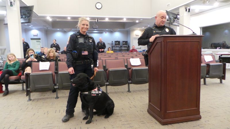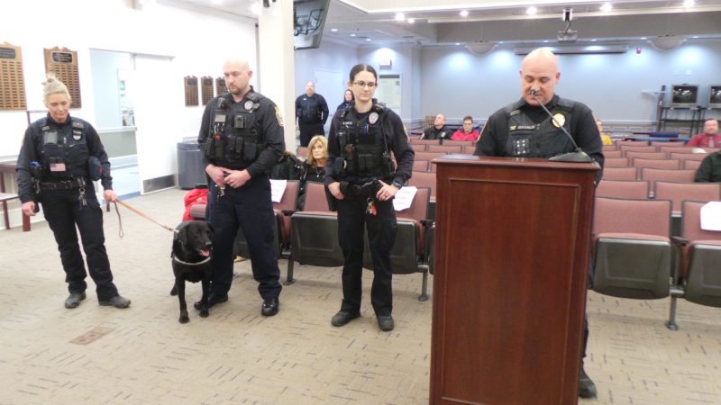 FRPD Chief Magalis explains how drug law dynamics at the state level led to the forced early retirement of K-9 Maverick, with handler Olivia Meadows. Meadows gets to keep her partner in his retirement.
