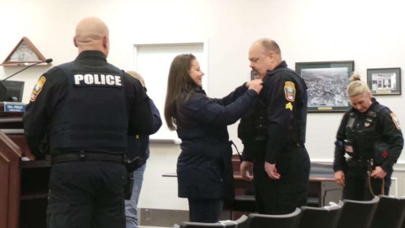 Chief Magalis with, from left, Officers Meadows and Maverick, Mark Hajduk, and Rachel Martin. Civilian communications officer Karen McDonald, back row just past the chief’s right shoulder in reddish top, has already taken a seat following her introduction to council. Below, David Fogle receives his sergeant’s pin from wife Kim.