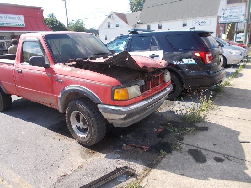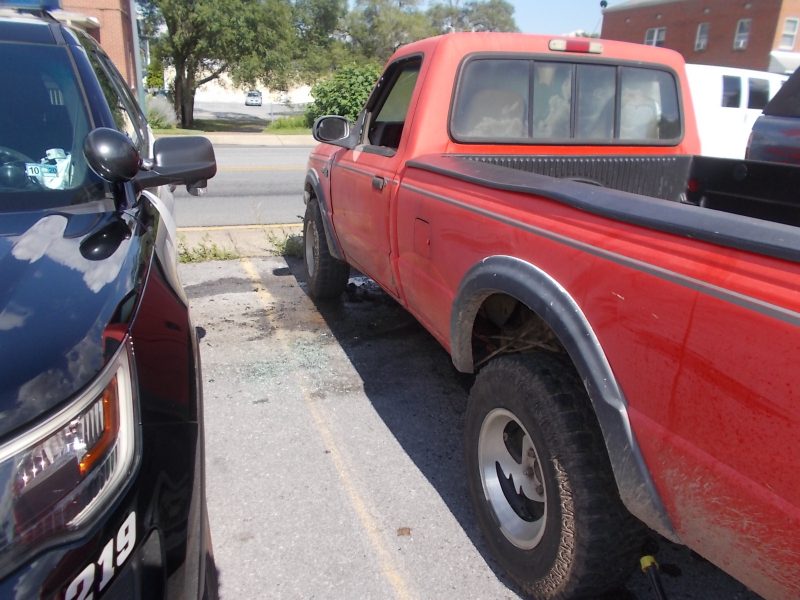 The involved 1993 Ford Ranger pickup was abandoned at scene by occupants. Contacted, the Hampshire County, West Virginia owner said he had given his daughter permission to take the truck and had been alerted that it had been damaged in Front Royal. Royal Examiner Photos/Roger Bianchini