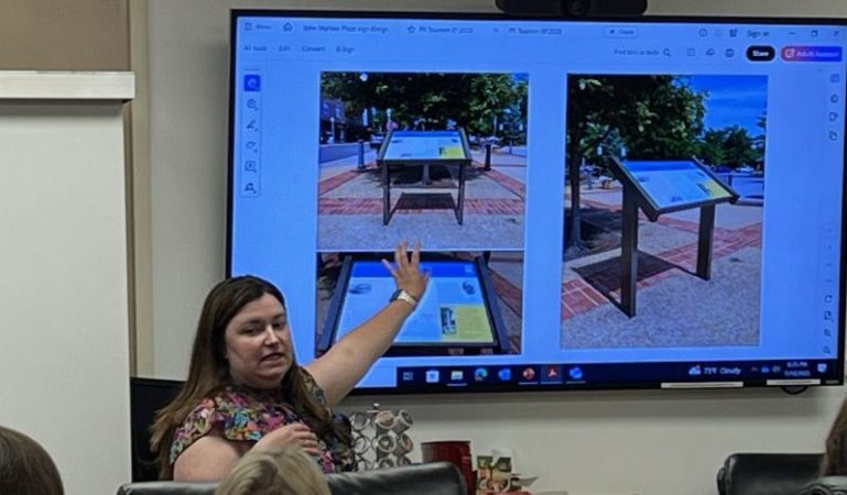 (Above) Former mayor John Marlow to be honored with a dedicatory sign at the John Marlow Plaza, formerly known as “the Gazebo” in downtown Front Royal. (Below) Tourism Director Lizi Lewis presents a draft of the sign to the council, pointing to a similar sign that it will resemble.