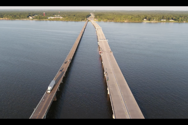 he original Nice-Middleton Bridge (left) and the replacement span (right) in August, as seen from a Maryland Transportation Authority flyover. The new bridge is set to open on Wednesday, demolishing the old span within hours. Screenshot.