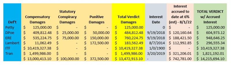In addition to the above personal liabilities, Poe’s EarthRight Energy (ERE) company ($948,646.25 in compensatory, punitive, interest) and Tran’s ITFederal ($10,419,327.38 compensatory) were also handed down by Warren County Circuit Court civil case juries in recent months.