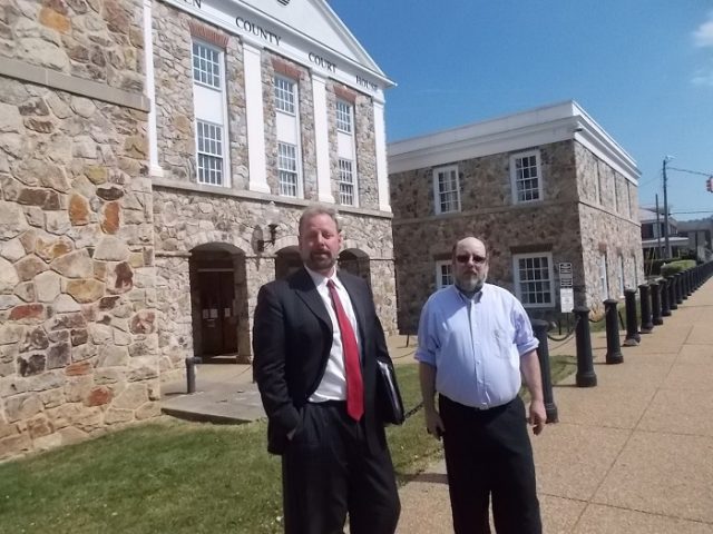 Plaintiff Paul Aldrich, right, and his counsel David Downes outside the Warren County Courthouse following Tuesday’s oral arguments for reconsideration of the court’s April 7 ruling Jacob Meza’s Jan. 4 council appointment to fill now Mayor Chris Holloway’s vacant council seat was allowed by Town Charter. Royal Examiner Photos by Roger Bianchini