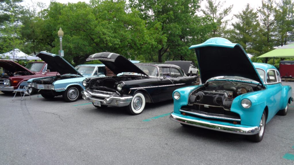 And then there were the CLASSIC cars – above, Paul Hutchins with his restored 1932 Ford ‘Roadster’ – and that is a nice vintage Chevy Corvette next door, as well as three variations on how the hood pops; below, line ‘em up – and under those hoods were reminders of an era when engines were more mechanical than electric …