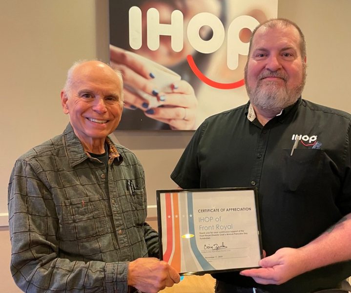 Pancake Day Chair Dr. Craig Zunka (left) presents a Certificate of Appreciation to Tim Wright, manager of Front Royal’s IHOP, for his generous donation of paper goods, butter, and syrup. The Kiwanis Club thanks IHOP for helping make Pancake Day a continued success!