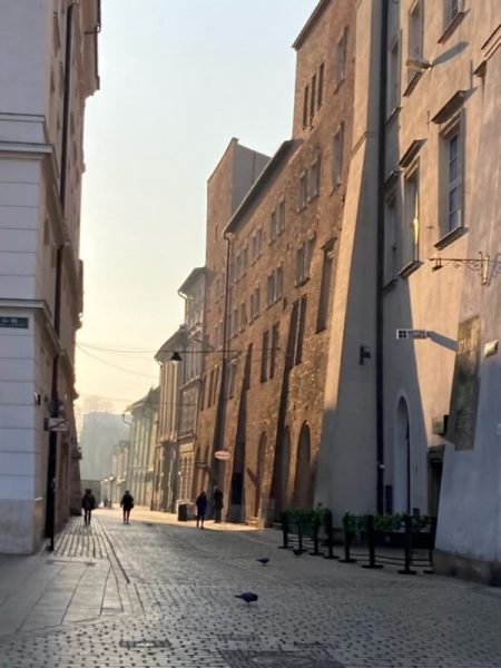 Krakow, Poland is a very old city, a vibrant city, dirty but no trash, almost ancient at its core with buildings that actually lean but somehow stay erect. Narrow brick streets lead to a giant city square. There are probably 100 restaurants, pastry shops, and pubs, each serving exceptional food at reasonable prices. This is old Krakow, never bombed in World War II. Catholic churches spiral upward to ridiculous heights. Symbols of the religion of Poland are everywhere adorning otherwise nondescript structures. Roads are more sidewalks than roads. Cars and delivery vans struggle for space. Just beyond the city’s core lie more mundane places, unadorned square buildings, cold looking, barren, almost industrial.