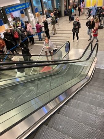 An elderly refugee pauses to rest against an escalator railing. (Photos by Stan Brooks)