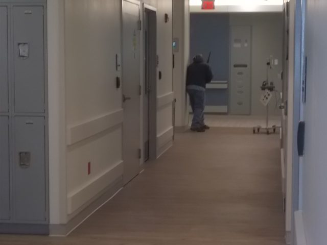 Things seem pretty quiet up here as media observer, NOT participant, arrives with police observer escort among other non-participant observers on the hospital’s 3rd floor. – Oh SHOOT, that was LOUD as suspect peeking around hallway wall seeks escape from approaching law enforcement units.