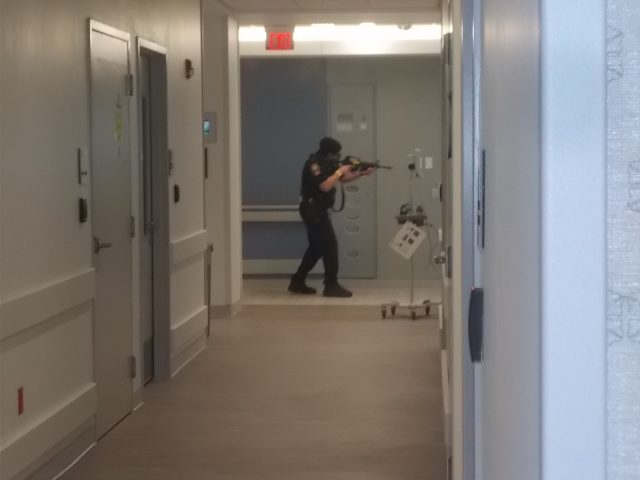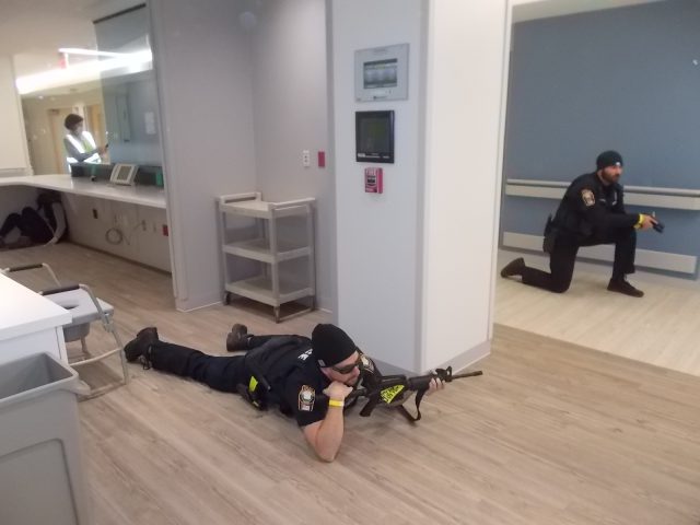 A quick stop in the first-floor Emergency Room found staff readying for casualties. In an actual incident, the wounded would likely be taken to another medical location than one at which an unresolved situation with armed suspects was occurring. Some momentary confusion over this reporter’s role as observer versus participant media led to a stern admonishment from a nursing supervisor participant to put his interview recorder away and leave the ER as the incident was progressing. That led to a quick “Yes, ma’am” and some laughter upon the explanation that I wasn’t really there – I was just a ghostly non-participant observer who, had he been participating would have been as far away from the incident site as hospital and law enforcement personnel wanted him to be – especially after those earlier glances from the armed suspects on the 3rd floor.