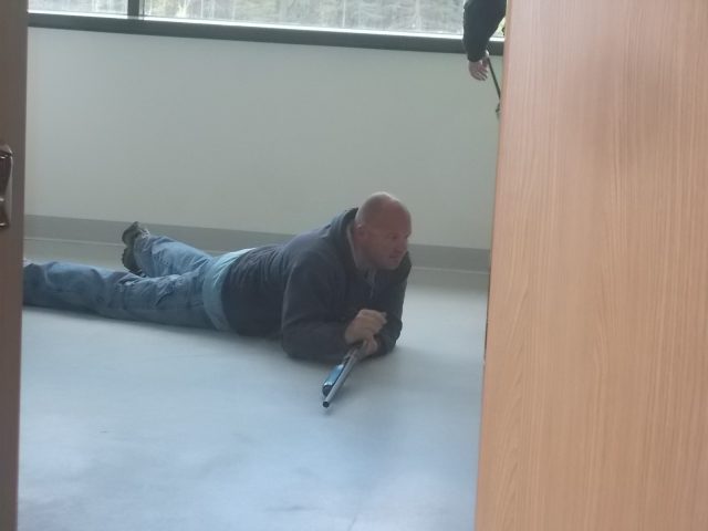 Normal, that is until several LOUD gunshots rang out, and I mean get-your-attention-and-hit-the-deck LOUD. I then saw, separately, two non-vested, non-uniformed individuals, first a woman, then a man, both with what appeared to be long barrel shotguns. Glancing down the hallway to where I had roamed slightly away from my escort and other vested non-participants, each gaze sent a momentary chill down my spine – a what if I didn’t have this vest on and what if this wasn’t an exercise – CHILL?!?