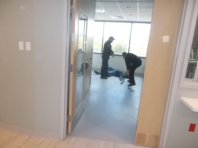 Above, as first responders track suspects, a hospital staff participant seeks refuge under desk from shots fired as vested observer, standing, tracks action. Below sequence: apparently wounded male suspect, with what appears to be a pump shotgun, is apprehended. Officer on floor then checks the well-being of the staffer hiding under desk, as Air-Care observer follows the situation.