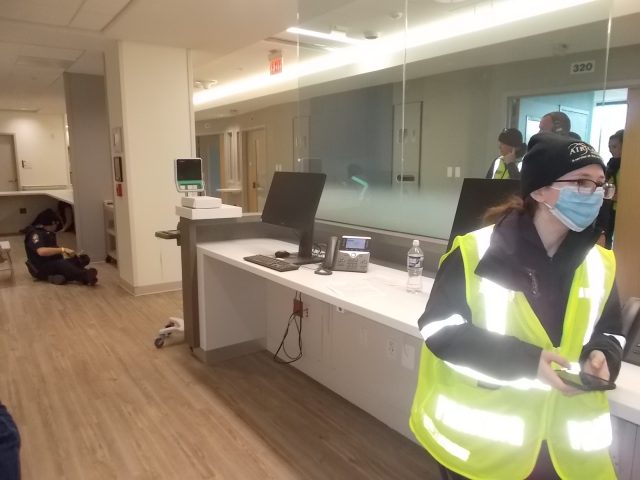 Invited as a media observer, I was outfitted with a reflective, day-glow green vest indicating a non-participant observer upon arrival. As the final day’s exercise was beginning around 8:30 a.m., I was led into the hospital, past vested construction workers aiming for the hospital’s targeted June opening date. After proceeding up a stairwell to the hospital’s third-floor, Warren County Emergency Services Coordinator Rick Farrall handed me off to Front Royal Police Captain and Public Information Officer Crystal Cline. Things seemed fairly normal as we encountered several other vested people, including Warren County Board of Supervisors Chair Cheryl Cullers.