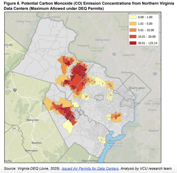 Potential carbon monoxide (CO) emission concentrations from Northern Virginia data centers (Maximum Allowed under DEQ Permits). (Source: “Modeling Localized Air Pollution Impacts from Data Centers in Northern Virginia”/VCU Institute for Sustainable Energy and Environment)