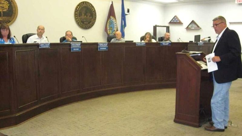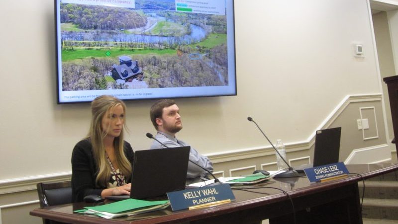 Campground permitting applicant Carl Ey explained variables involved in his proposed project off Panhandle Rd. Below, Planning & Zoning staffers Kelly Wahl and Chase Lenz at the staff table as Ey presented a graphics-assisted PowerPoint on his proposal.
