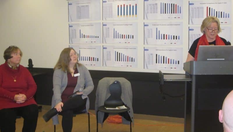 Royal Examiner file photo of Samuels Library Director Erin Rooney, seated center, Library Director of Operations Eileen Grady, seated left, and Board of Trustees President Melody Hotek, at podium, during one of the library’s Question & Answer forums, this one dated to December 7, 2024. The announced forums were called to review operational financing questions raised by county supervisors.