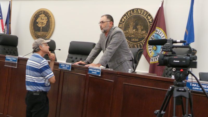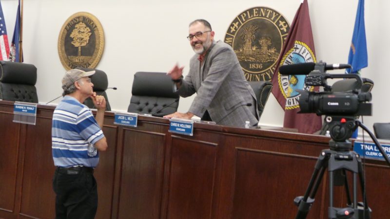 Above, between council’s open meeting and a closed session, Bruce Rappaport and Chris Holloway discuss their varying perspectives on the Town-EDA-FRPD headquarters situation. Below, notice the Royal Examiner camera pointed his way, Holloway may be suggesting we wait to snap that shot until he’s convinced council candidate Rappaport to see things from the incumbent council’s perspective.