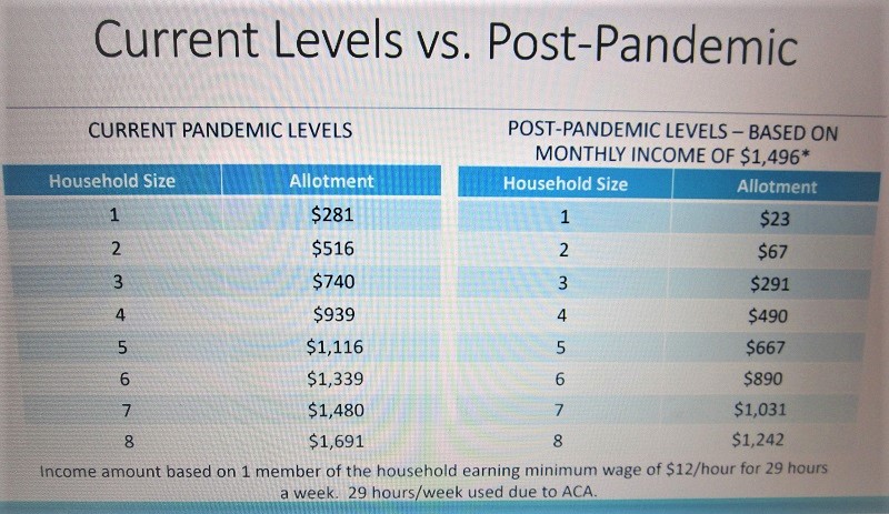 County Social Services Director Jon Martz clicks at PowerPoint display on coming roll backs of federal COVID relief benefits as the pandemic Public Health Emergency ‘unwinds’. Major hits are impacting the SNAP food assistance program as shown in graph in final photo below.