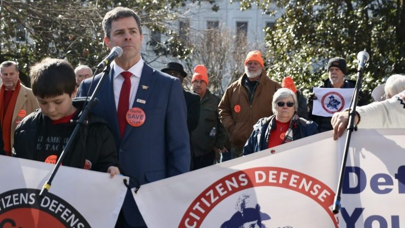 U.S. Rep. John McGuire, R-Goochland, speaks at the Virginia Citizens Defense League rally on Jan. 19, 2026. (Photo by Charlotte Rene Woods/ Virginia Mercury)