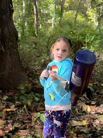 Adelyn Hoover demonstrates how to safely pick up an old bottle off the forest floor by using her trusty litter picker-upper!