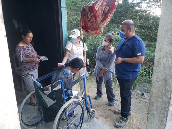 Dr. Shyama Rosenfeld, left, leads a team visiting a handicapped young woman in her mountainside home near Pinares, Honduras.