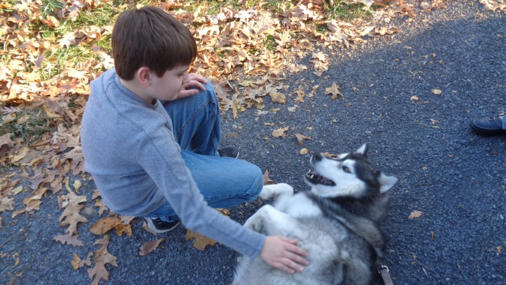 Music Park howler Pola the Husky gets a rewarding belly rub from Whill Stanley during pre-dedication down time.