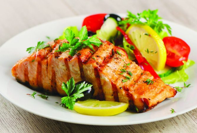 1. Mix all of the ingredients — except the salmon, parsley and lemon wedges — in a bowl.