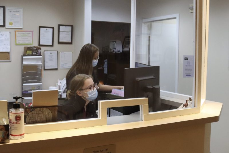 Kelsey and Katrina, who asked to be identified by their first names for security reasons, working at the front desk of Clinics for Abortion & Reproductive Excellence, an abortion clinic in Bethesda, Maryland. The staff has seen an increase in out-of-state patients and workers in the two months since the reversal of Roe v. Wade. (Abby Zimmardi/Capital News Service)