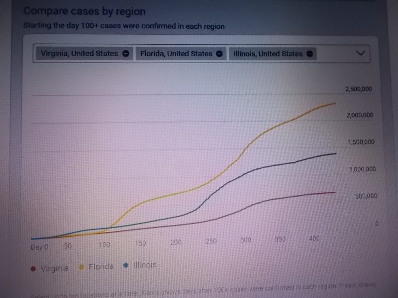 Virginia Governor Ralph Northam has critics for his Executive Order mandates on social distancing and limited indoor seating through the pandemic, but this chart indicates in comparison to at least two states, Florida and Illinois, those precautions have paid off statistically in the number of cases reported; and if national and global statistics are an indicator, that will transfer into better number in related statistics like hospitalizations and fatalities as well.