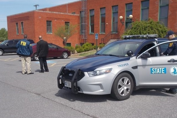 Jennifer McDonald after the second of her two state prosecution arrests in the summer of 2019. Below, VSP and FBI at EDA offices in April of 2019, when they searched premises for potential ‘financial scandal’ evidence, including McDonald’s former office and work computer. She was charged criminally at the state level in July and August of that year. Mug Shot Courtesy RSW Jail; Royal Examiner File Photo