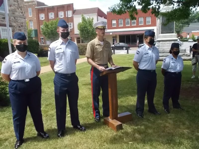 Memorial Day Co-Chair and Marine Reserve Lt. Col. Robert MacDougall with R-MA Cadet Honor Guard at last year’s Memorial Day ceremonies at the courthouse