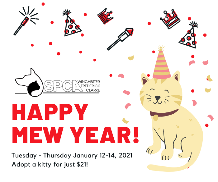 The SPCA of Winchester, Frederick, and Clarke Counties is hosting a MEW Year adoption special. Mask up and stop by the adoption center at 111 Featherbed Lane and adopt a kitty for just $21!