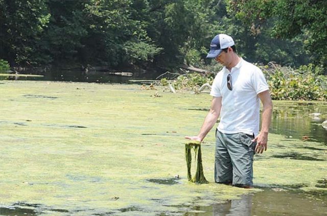 I don’t know if I’d drink out of it anyway – Former Shenandoah Riverkeeper Jeff Kelbe examines Shenandoah River cattle manure-fed algae bloom in 2017. OH WAIT, that’s what those tens of millions of dollars in water and wastewater plant upgrades are all about, right? Photo Courtesy Shenandoah Riverkeeper