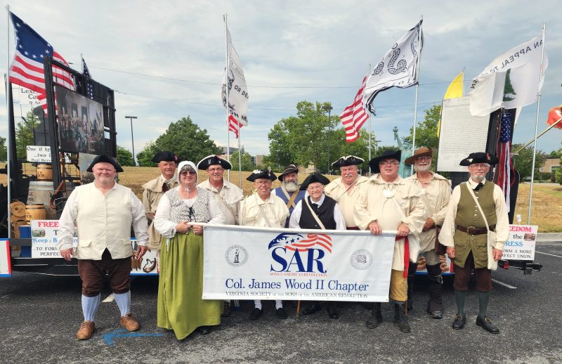 In addition to the float, the SAR chapter’s entry included a vehicle adorned with flags and accompanied by four marching guardsmen. These guardsmen carried the U.S. Flag, the Virginia Flag, and the chapter banner, proudly leading the SAR contingent. As the entry passed through the streets, compatriots led the spectators to cheer for the United States and wish everyone a Happy Fourth of July.