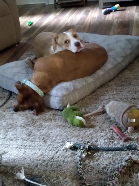 Six-year-old Luna, left, is greeted by her younger adopted ‘sister’ Holly, who wants to make up for lost play time. Below, all that playing can wear a dog out; and further below, Holly has convinced Luna to share the big bed. Courtesy Photos Lambert family