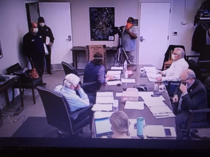 ‘Donuts for us!?!’ – The board’s normal three-member live quorum of Mabe-Cullers-Fox was buoyed by Tony Carter’s arrival, a bit late, he explained having brought Apple House donuts for his colleagues. Sorry Delores, they don’t taste as good by virtual hook up. Carter soon retreated to the safety of his car and a phone connection to the remainder of the meeting.