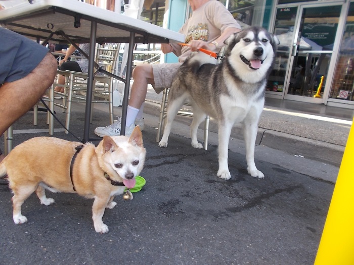 Pals Rico, left, and Diva at outdoor portion of Friday’s ‘Yappy Hour’ at ViNoVa – Below, ‘Could we have some more water in our bowls, please’ these 2 hot dogs may have been thinking; and water they got under the tent shade.