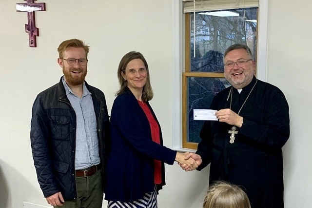 Karena Tapsak and her son Peter presenting a check from Mountain View Music to Rev. Robert Hitchens, pastor of Saints Joachim and Anna Church in Front Royal.