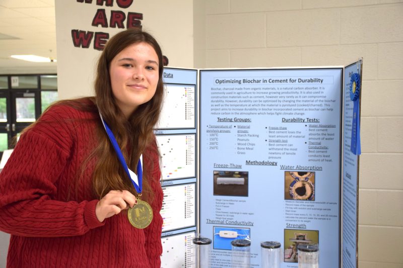 Rebecca Fowler, Junior, Optimizing Biochar in Cement for Durability, Runner-up for Grand Prize, Alternate to International Science & Engineering Fair, 1st place, Engineering: Materials & Bioengineering. Invited to Virginia State Science and Engineering Fair (April 5).