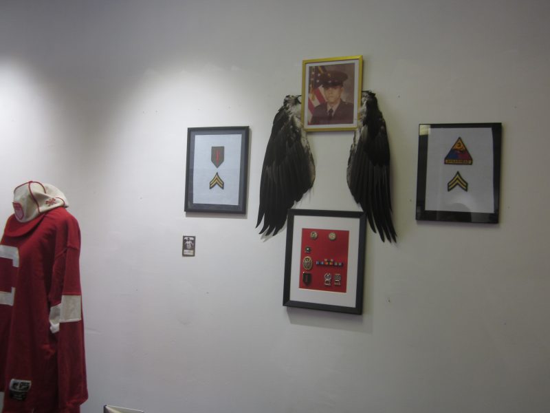 Wall displays acknowledging the U.S. military service of two Indigenous Americans. The first is Little Snowbird’s father, the second her brother, Littlewolf.