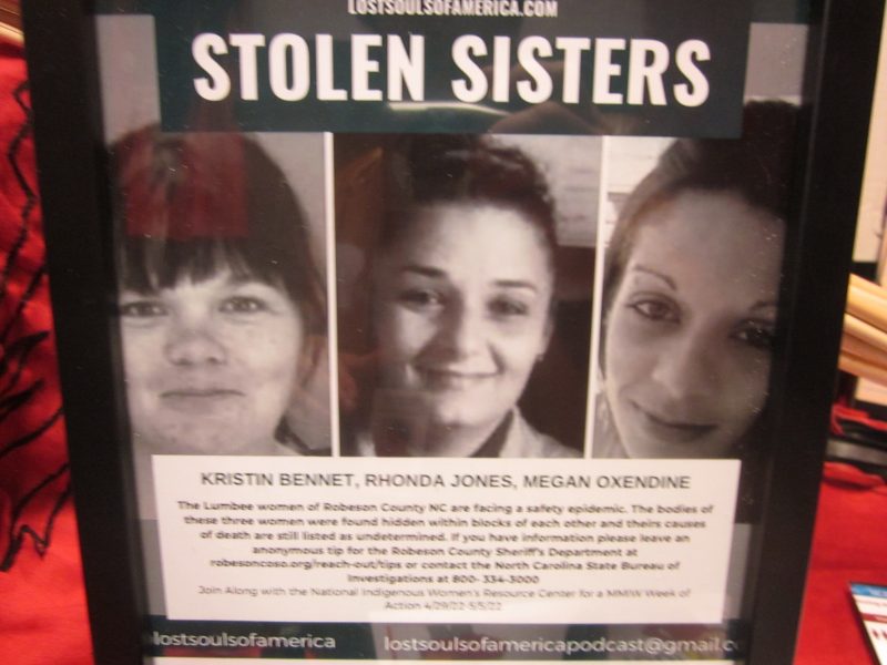 Little Snowbird at table display of a disturbing trend of MMIW – Missing and Murdered Indigenous Women, and girls, that continues to this day. She is, in fact, an MMIW survivor.