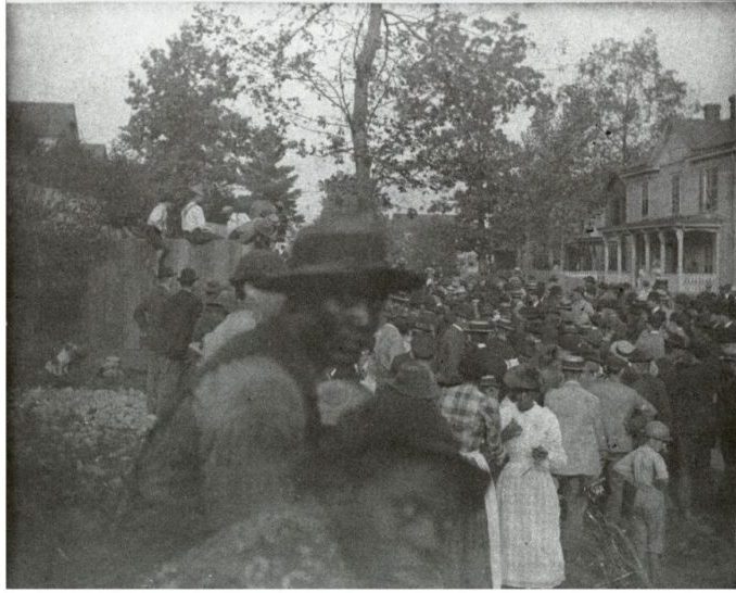 Spectators gather near a hickory tree in Roanoke, Virginia, in 1892, at the intersection of Mountain Avenue and Franklin Road, where a Black man named Thomas Smith was lynched by a mob, accused of assaulting a white woman. (Virginia Museum of History & Culture)